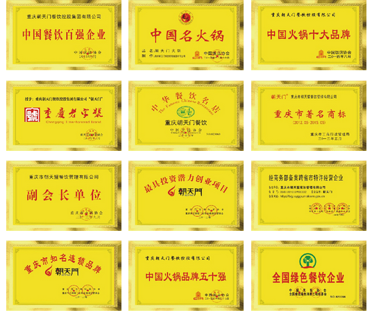 朝天門火鍋憑借其濃郁醇厚的火鍋味道以及民眾的認(rèn)可度,獲得過”火鍋品牌五十強”、“全國綠色餐飲企業(yè)”、“中國五星級火鍋企業(yè)”、“重慶老字號”、“中國火鍋領(lǐng)軍品牌”等多項榮譽。