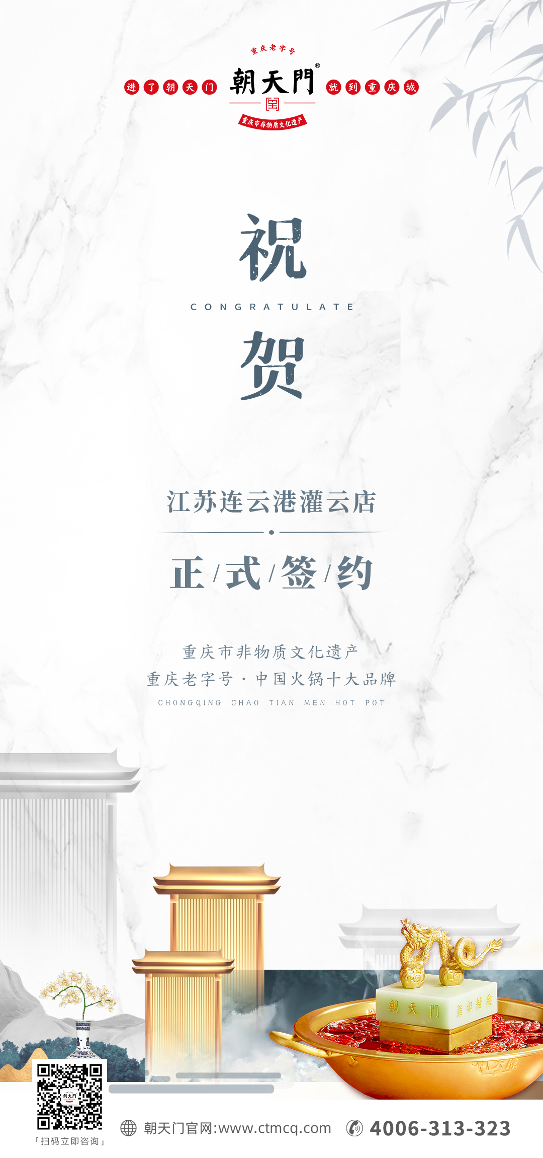 在一切合作細(xì)節(jié)和加盟內(nèi)容都敲定完畢后,孫總迅速與朝天門火鍋簽訂了加盟合同,這也標(biāo)志著朝天門火鍋即將帶著重慶老字號(hào)的榮譽(yù)入駐江蘇灌云縣。