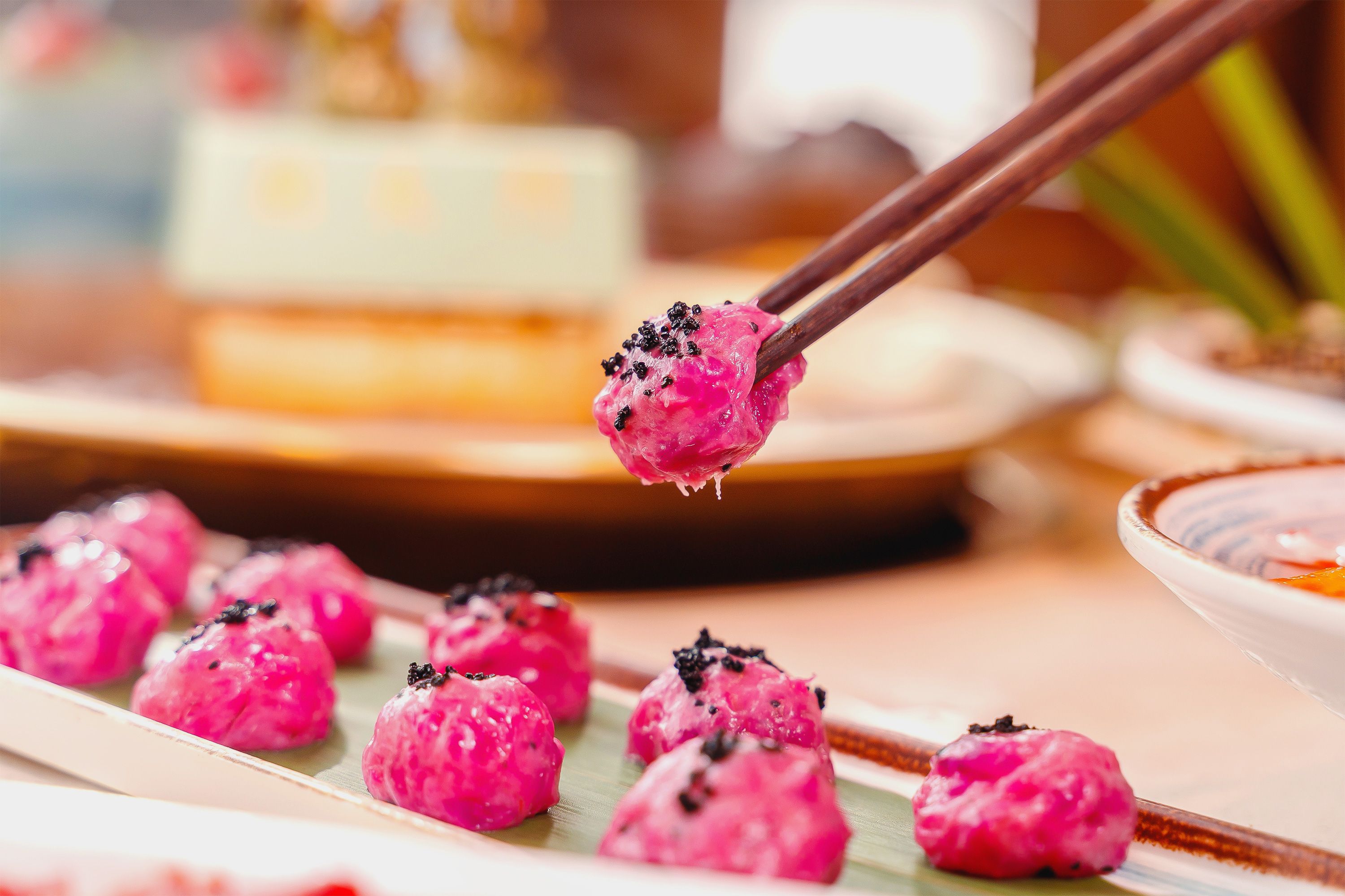 紅心火龍果,味道清甜,營養(yǎng)價值高,非常適合小朋友和女性食用,是一味比較好的水果食材。而朝天門火鍋恰好利用多元組合的方式,將這樣的食材引進(jìn)到火鍋餐桌上來,將火龍果與蝦滑揉和在一起,讓蝦滑的鮮透露著水果的甜,口感十分獨特。