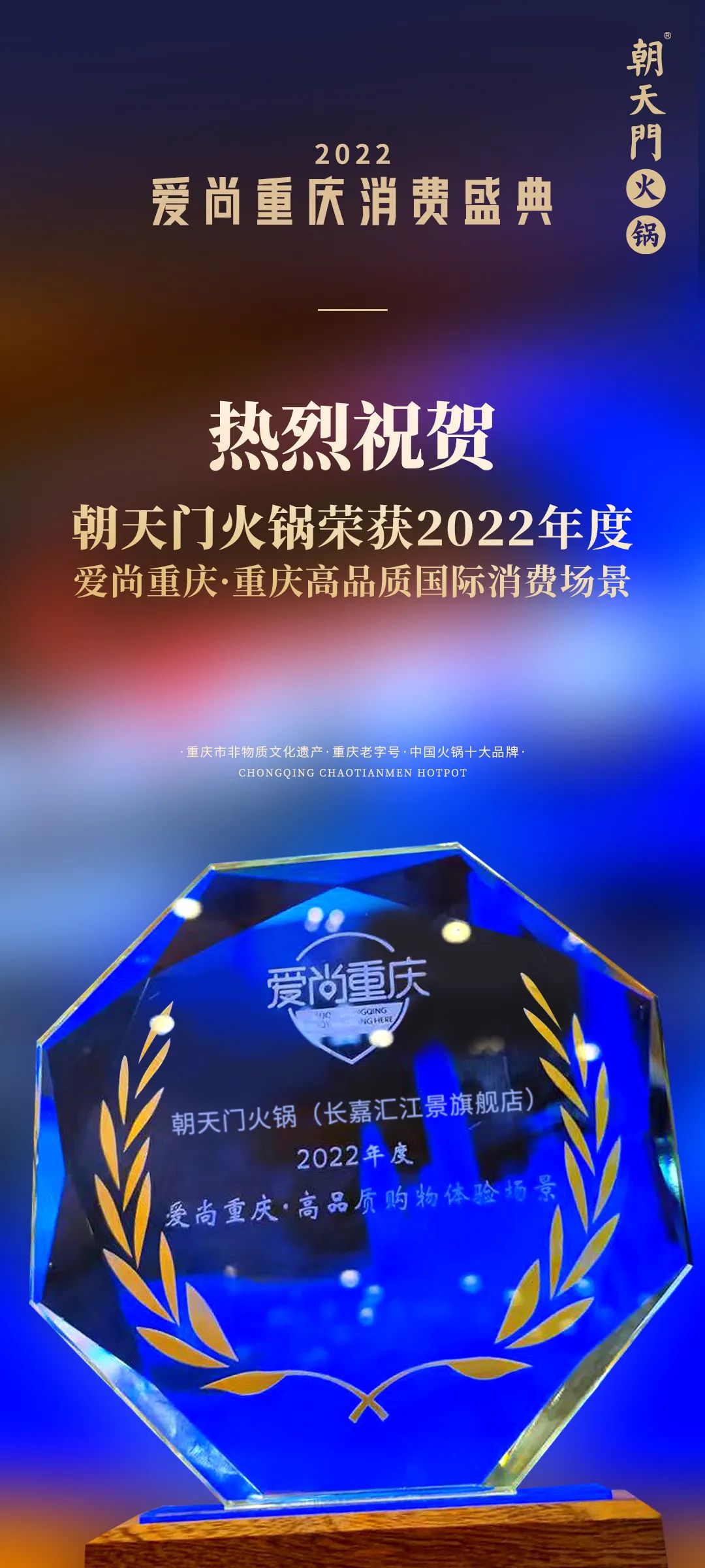 喜報(bào) | 恭喜朝天門(mén)火鍋獲得愛(ài)尚重慶·2022重慶高品質(zhì)國(guó)際消費(fèi)場(chǎng)景榮譽(yù)!