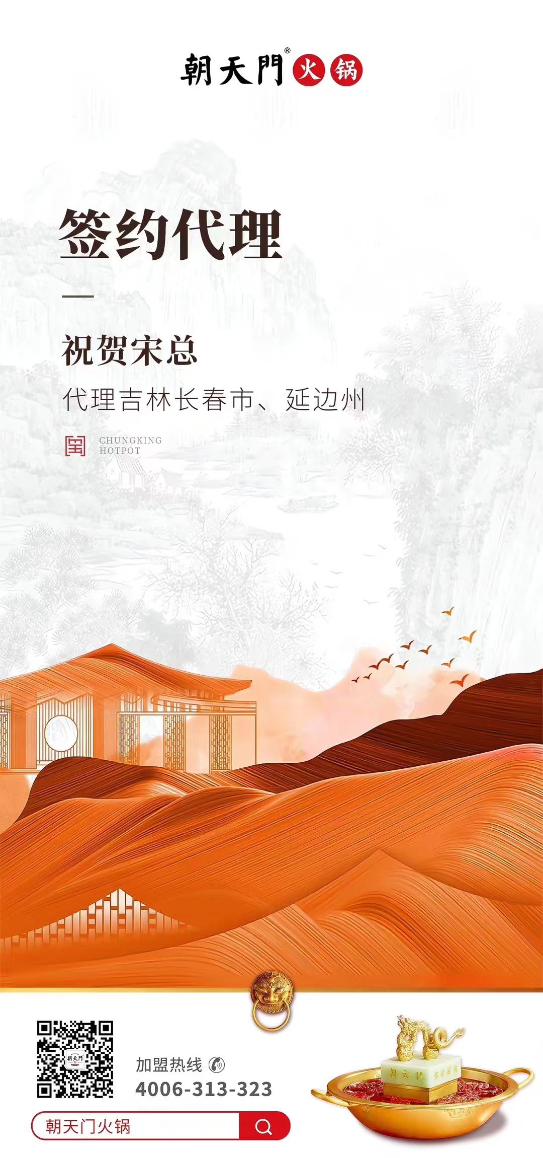 宋總慧眼如炬,用強大洞悉力充分挖掘,朝天門火鍋品牌價值,所以才毫不猶豫拿下朝天門火鍋吉林長春市、延邊市的代理權(quán),朝天門品牌的市場名氣和雄厚實力,也能給予宋總?cè)谭龀郑谶@里,我們要再次感謝宋總的信任和支持,預(yù)祝宋總生意興隆,財源不斷!