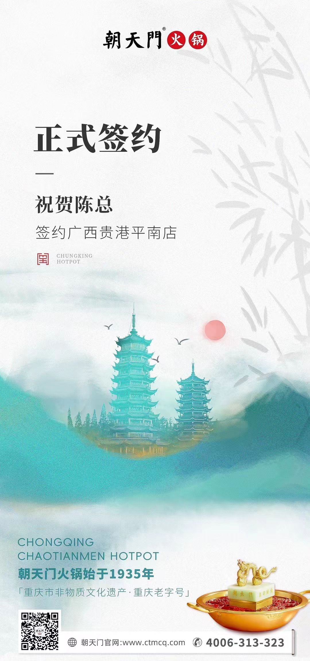廣西貴港平南縣陳總慧眼如炬,選擇加入朝天門這個有溫度有力量的大家庭,我們相信,這不僅是陳總對重慶地道火鍋的厚愛,更是對朝天門品牌的信任與支持,朝天門火鍋勢必在廣西餐飲市場大展宏圖,也提前預祝陳總生意興隆,財源廣進!