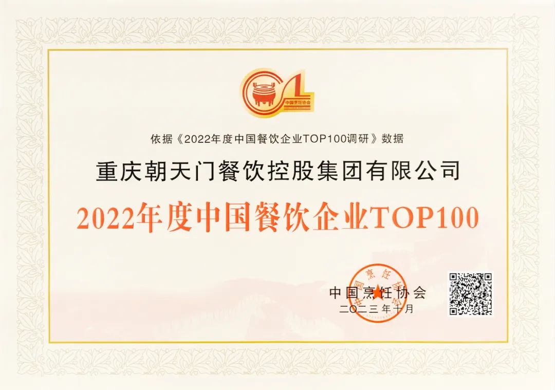 2022年度中國餐飲企業(yè)TOP100第七名,朝天門餐飲控股集團連續(xù)11年獲此殊榮!