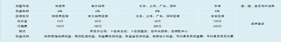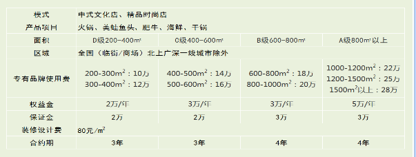 下面,見詳細的費用標準分析,是針對區(qū)域或城市的等級以及店鋪面積的大小來制定,分為單店以及區(qū)域兩種標準:
